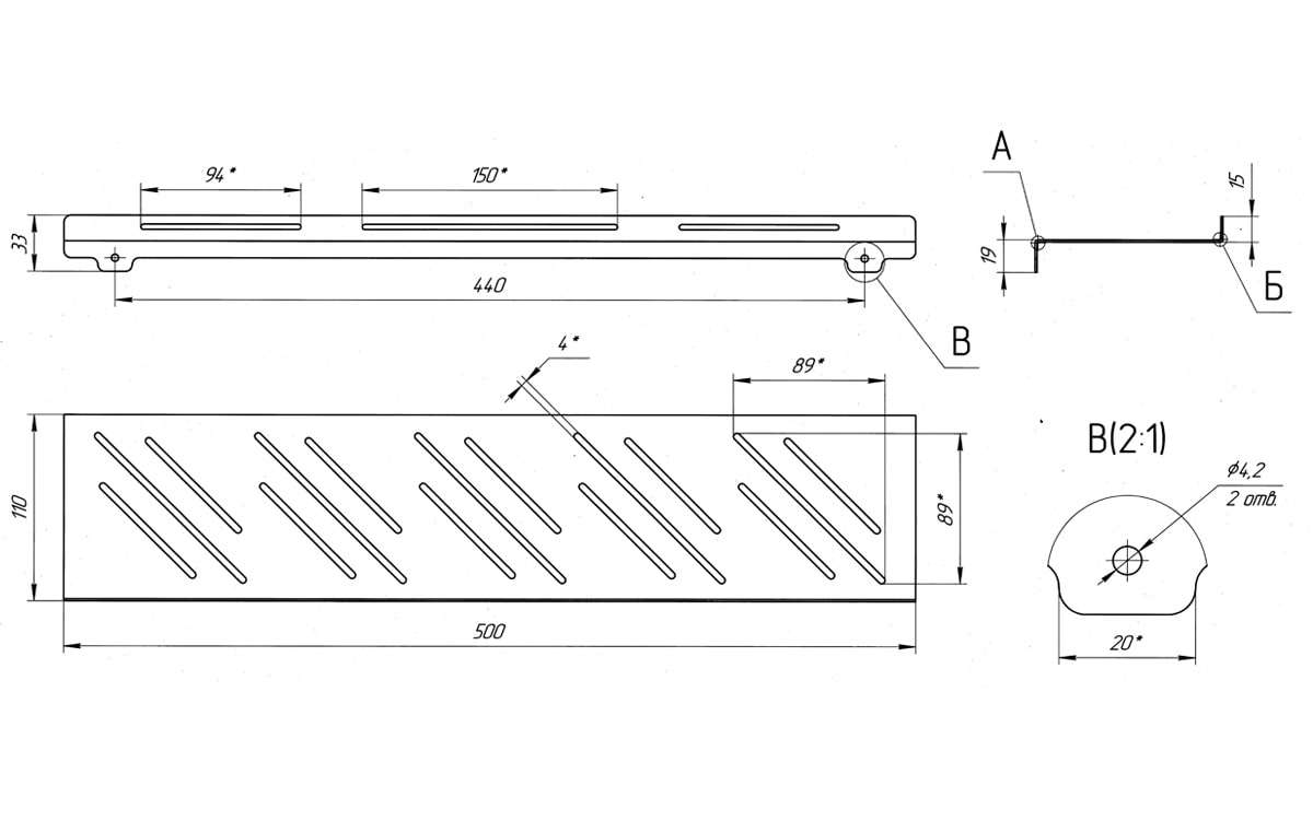Shelf straight - 1 pc, mounting (galvanized screw with dowel, washer, gasket) - 2 pcs, decorative cap - 2 pcs, passport - 1 pc.