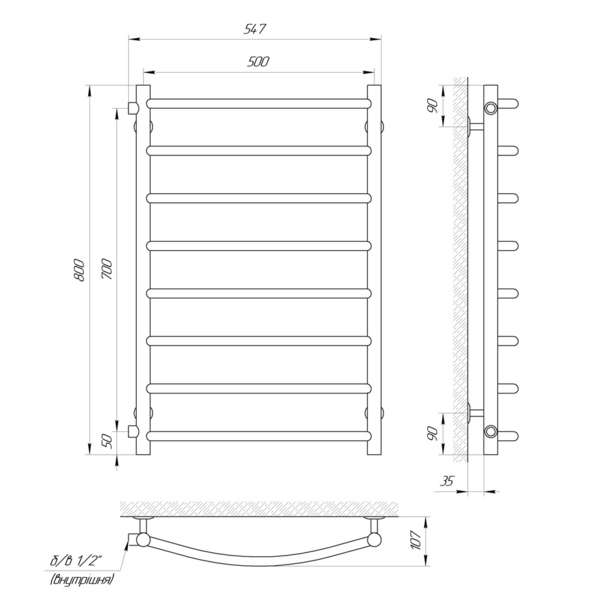 Водяной полотенцесушитель Laris Классик П8 500 х 800 б/п 1/2" мц 700 Laris